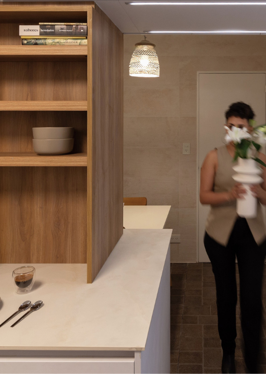 Con un enfoque en maximizar espacios de guardado, y darle vida a este espacio, diseñamos el mobiliario pensando en cada detalle, eliminando el ruido visual y que a su vez, se pueda aprovechar más superficie de mesada